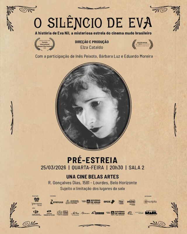 O documentário “O Silêncio de Eva”, dirigido por Elza Cataldo e protagonizado pelas atrizes Inês Peixoto e Bárbara Luz, será lançado no dia 26 de março, no Una Cine Belas Artes, em Belo Horizonte. A obra apresenta ao público uma narrativa sensível e poética sobre a vida de Eva Nil, uma das figuras mais enigmáticas do cinema mudo brasileiro, propondo uma reflexão sobre memória, apagamento e reconstrução histórica.