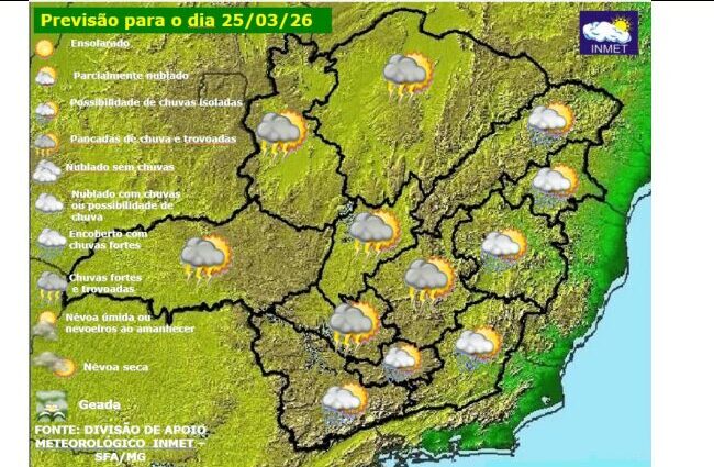 O tempo em Minas Gerais, nesta quarta-feira (25/3), deve ser de céu parcialmente nublado, com pancadas de chuva e trovoadas isoladas nas regiões Noroeste, Norte, Central, Triângulo Mineiro, Alto Paranaíba, Oeste e Metropolitana de Belo Horizonte (RMBH), enquanto nas regiões dos vales do Jequitinhonha, Mucuri, Rio Doce e na Zona da Mata, o dia deve ser de céu parcialmente nublado, com possibilidade de chuvas isoladas. Nas demais regiões, a previsão é de céu claro a parcialmente nublado, com possibilidade de chuvas isoladas.